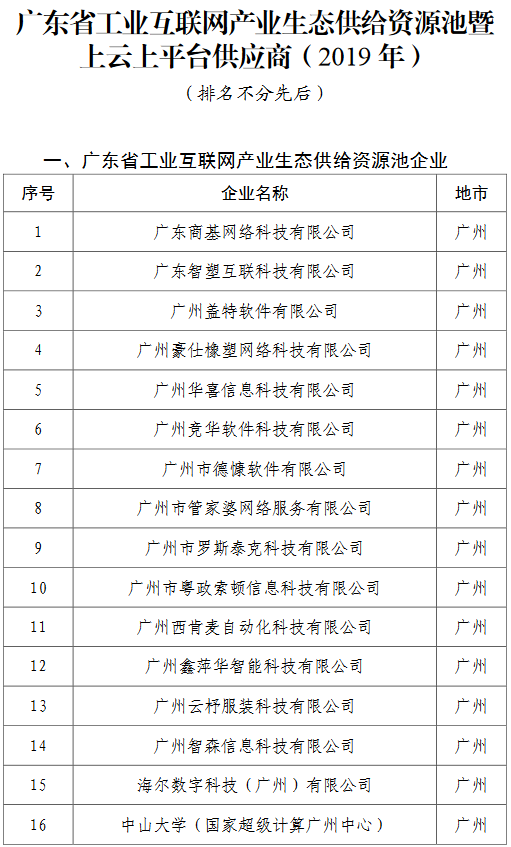 為推動(dòng)制造業(yè)數(shù)字化、網(wǎng)絡(luò)化、智能化轉(zhuǎn)型升級,不斷發(fā)展壯大廣東工業(yè)互聯(lián)網(wǎng)產(chǎn)業(yè)生態(tài)體系,根據(jù)《廣東省工業(yè)和信息化廳辦公室關(guān)于組織申報(bào)廣東省工業(yè)互聯(lián)網(wǎng)產(chǎn)業(yè)生態(tài)供給資源池暨上云上平臺供應(yīng)商(2019年)的通知》(粵工信辦函〔2019〕30號)和《廣東省工業(yè)和信息化廳關(guān)于印發(fā)廣東省工業(yè)企業(yè)上云上平臺服務(wù)券獎(jiǎng)補(bǔ)工作方案(2019)的通知》(粵工信工業(yè)互聯(lián)網(wǎng)函〔2019〕1553號)文件要求,我廳先后組織開展了2019年第一、二、三批廣東省工業(yè)互聯(lián)網(wǎng)產(chǎn)業(yè)生態(tài)供給資源池暨上云上平臺供應(yīng)商的申報(bào)和遴選工作。經(jīng)企業(yè)申報(bào)、專家評審和網(wǎng)上公示,現(xiàn)予以公布。
